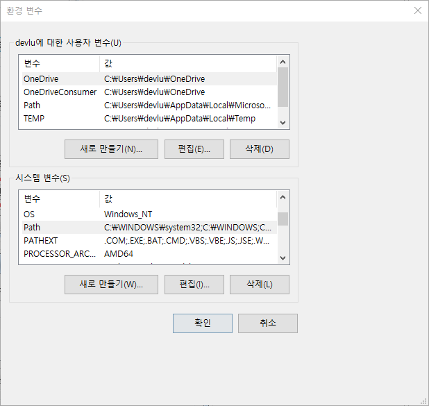 다음과 같은 창이 뜨면, 시스템 변수(S) 항목에서 Path를 찾은 다음, 아래쪽 '편집' 버튼을 눌러준다