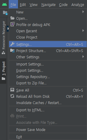 Android Studio 를 열고 File → Settings 를 클릭한다