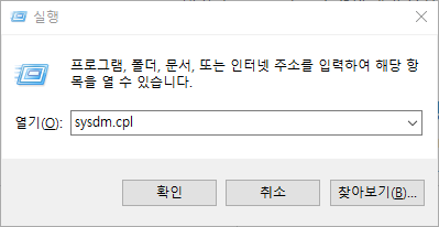 윈도우키 + 'R' 을 누르면 실행창이 뜨는데, 여기에 'sysdm.cpl'을 입력한다