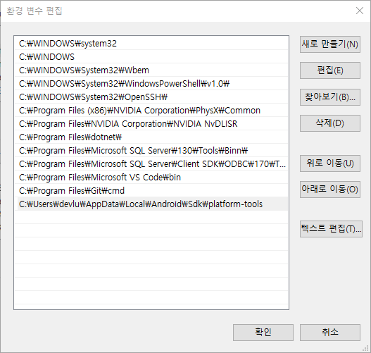 새로 만들기를 누른 뒤, '{Android SDK 경로}\platform-tools' 경로를 입력해준다.