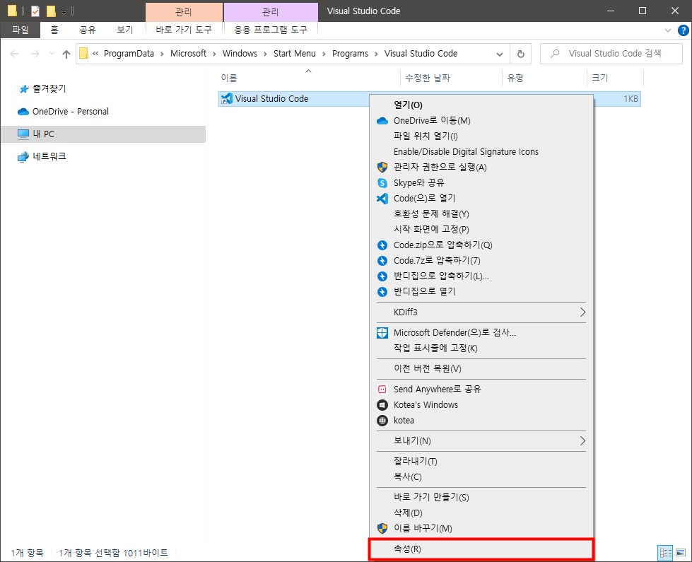 이후 Visual Studio Code 실행 파일을 오른쪽 클릭 후, '속성'을 클릭합니다.