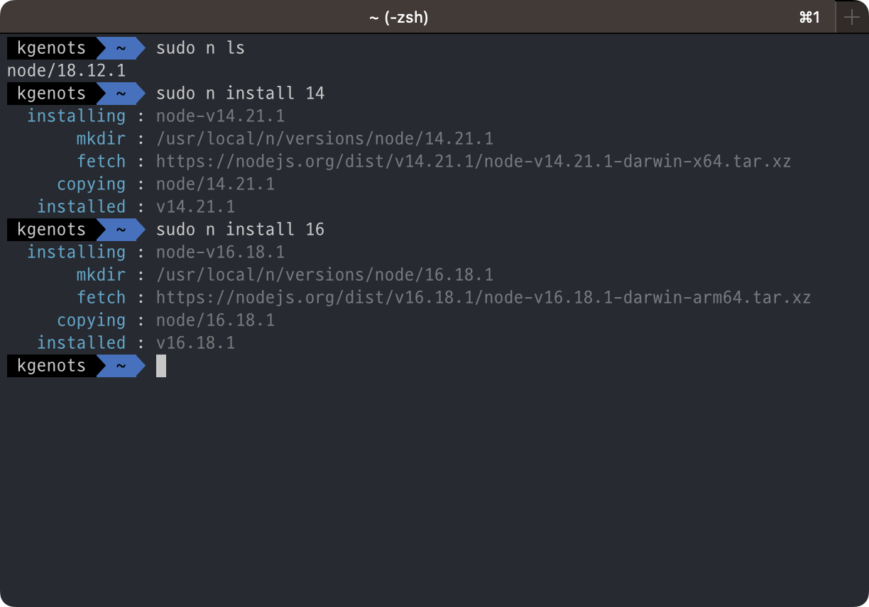3. 추가로 필요한 Node.js 버전 설치 ( 명령어: sudo n install {버전} )